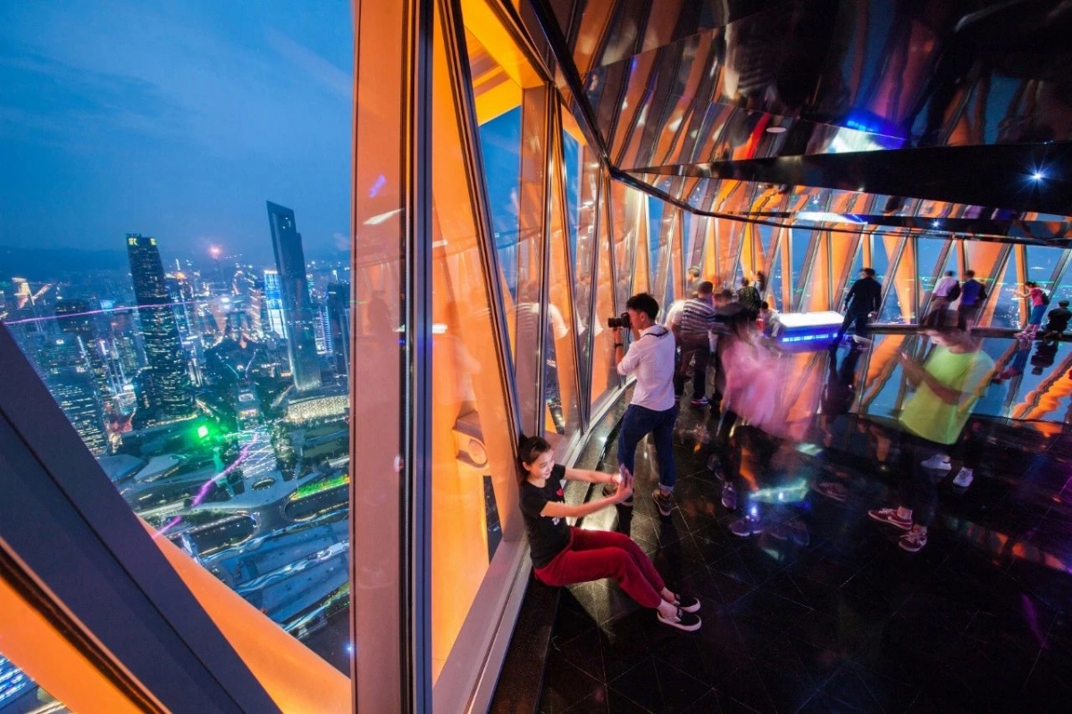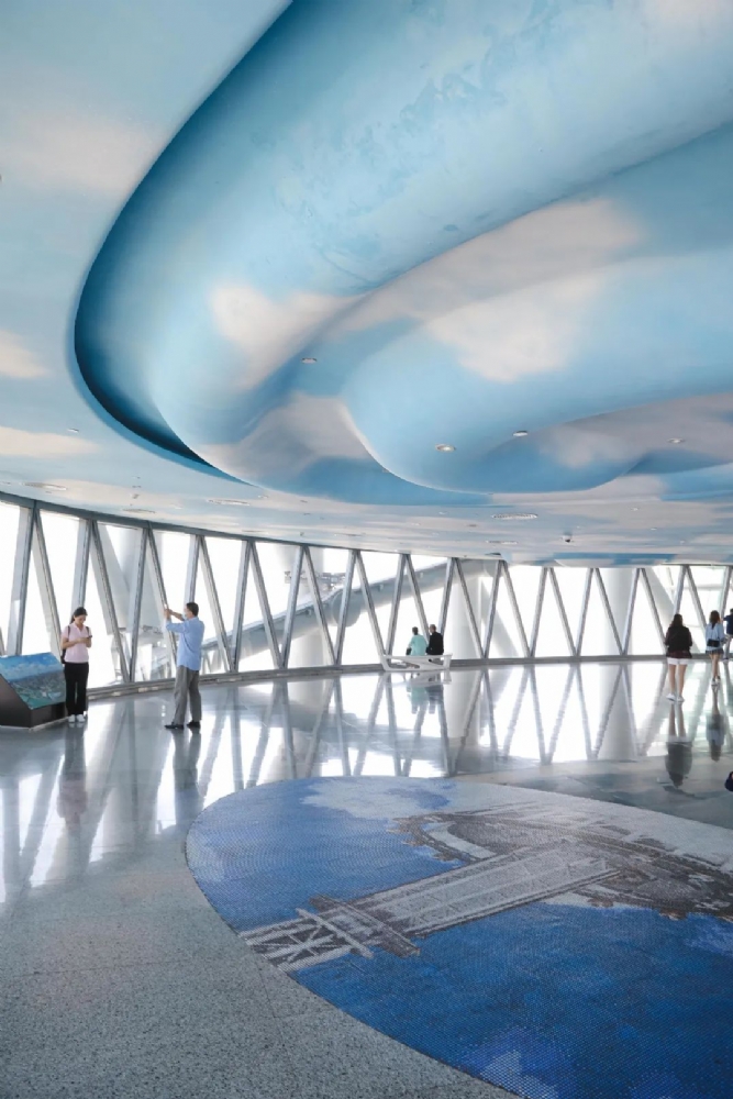 433米白云星空观光大厅是以白云和星空为主题的两层观光大厅,广州塔室内观光的最高点。站在360度落地观景玻璃前,能让你尽情的欣赏城市美景。
