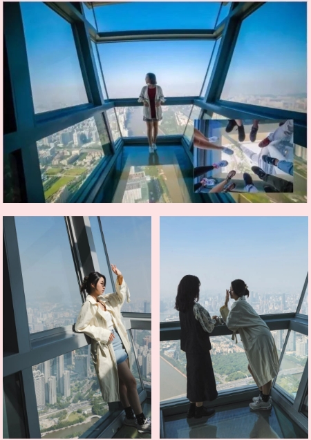 大厅还设有全透明玻璃“悬空走廊”,给你刺激的凌空观景体验,这里也是拍摄留念的绝佳地点。以及纪念品售卖专柜和空中吧,是集吃喝玩乐购于一体的观光大厅,在这里,你可以尽情的拍拍拍、购购购、逛逛逛~