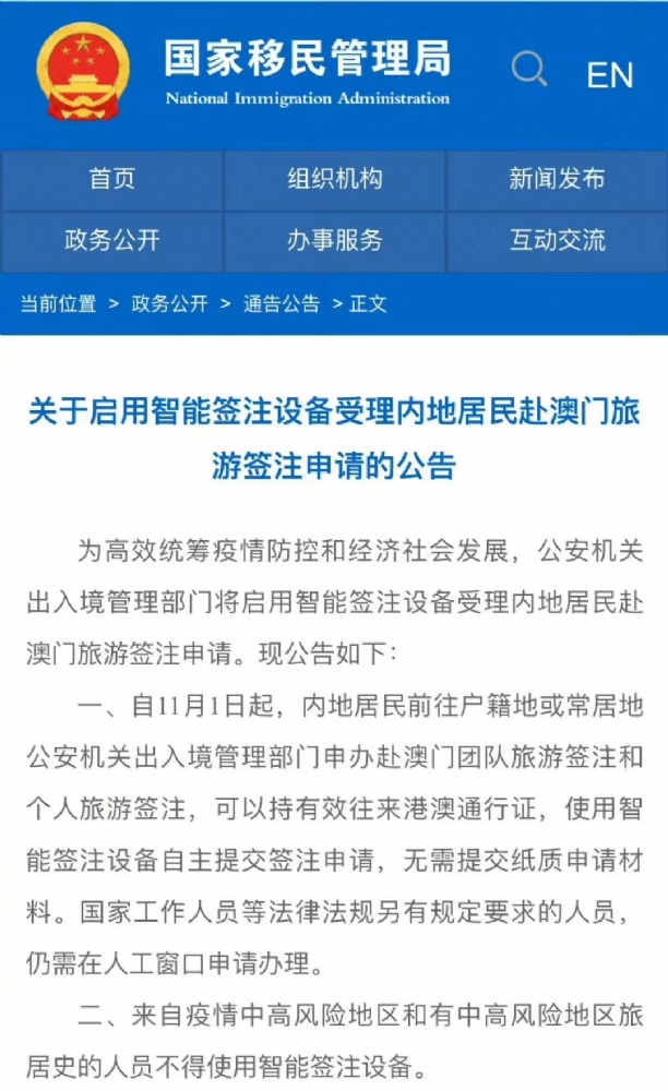 10月31日消息,国家移民管理局发布公告,为进一步便利内地居民申办赴澳门旅游签注,中华人民共和国出入境管理局决定,自今日(11月1日)起在全国公安机关出入境窗口启用智能签注设备受理内地居民赴澳门旅游签注申请。