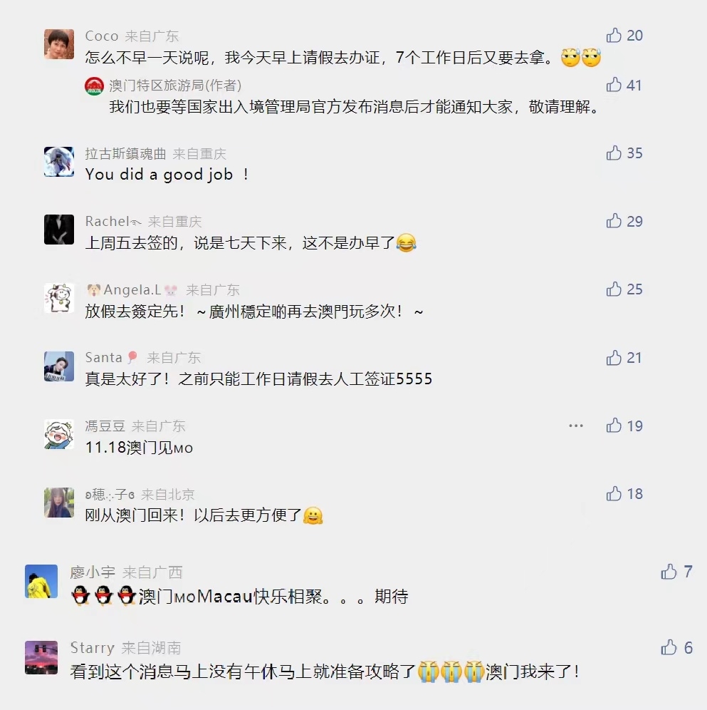 在澳门特区旅游局微信公众号上,众多内地游客针对启用内地赴澳门旅游智能签注的好消息纷纷留言,热情高涨。