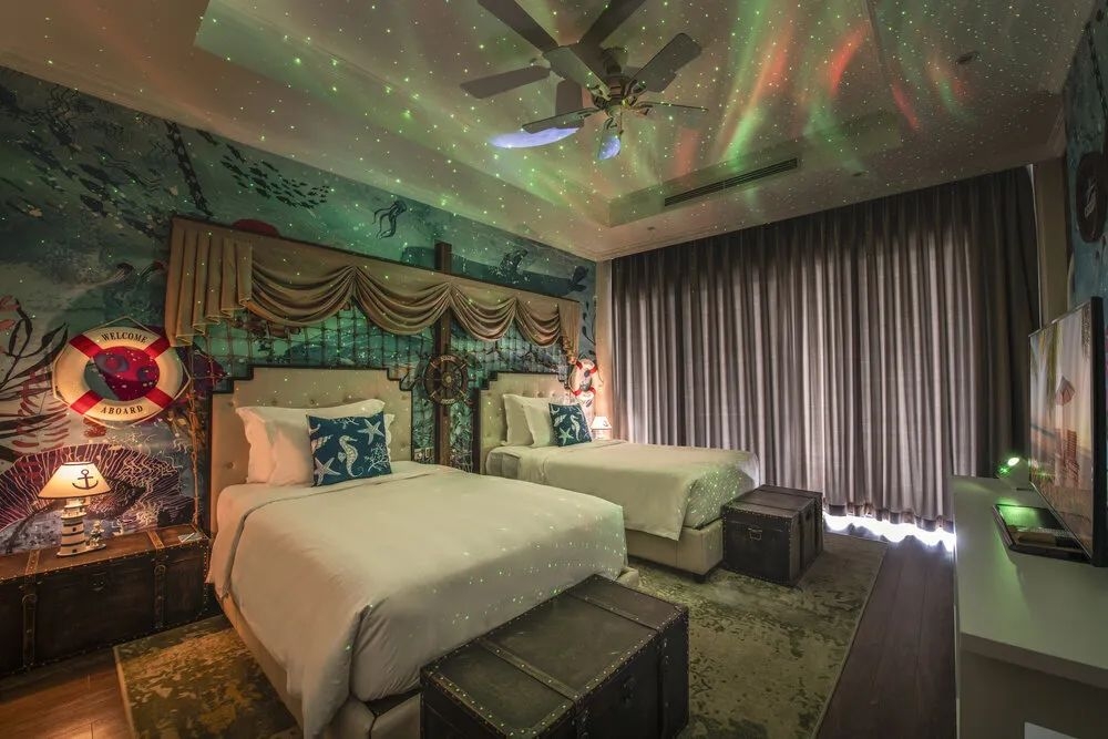 同样深受游客欢迎的还有450平方米的四居湖景鹦鹉螺别墅,专为儿童设计的海洋房,完美诠释了海洋奇观,为全家人提供生动有趣的豪华住宿体验。