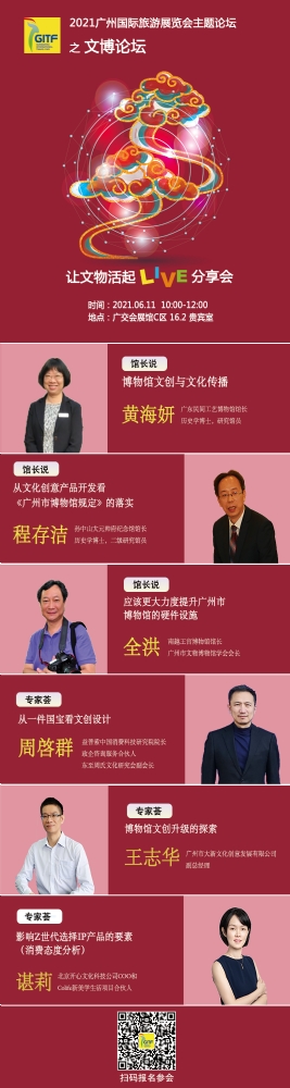 2021广州国际旅游展览会将于6月11日在中国进出口商品交易会展馆C区16.2馆举办主题论坛活动—— “让文物活起Live 分享会”。活动将邀请博物馆馆长及文创达人挖掘文物本身的故事,讨论如何将文物和文化IP融合到文创产品之中,让收藏在博物馆里的文物、陈列在广阔大地上的遗产、书写在古籍里的文字都活起来。