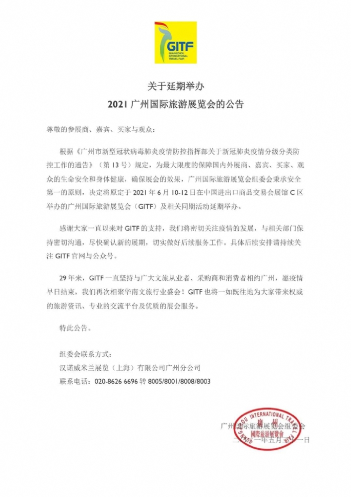 根据《广州市新型冠状病毒肺炎疫情防控指挥部关于新冠肺炎疫情分级分类防控工作的通告》(第13号)规定,为最大限度的保障国内外展商、嘉宾、买家、观众的生命安全和身体健康,确保展会的效果,广州国际旅游展览会组委会秉承安全第一的原则,决定将原定于2021年6月10-12日在中国进出口商品交易会展馆C区举办的广州国际旅游展览会(GITF)及相关同期活动延期举办。