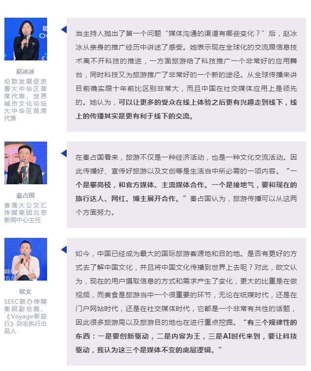 论坛的主要探讨话题回归到了“如何通过国际传播来更好地做文旅高质量发展”的话题上。赵冰冰举了个例子,她介绍了去年推出的“大家一起来伦敦”的全球推广项目。该项目集合了伦敦旅游局、所有的会员城市、线上媒体、线下媒体、官媒、达人等形成一个传播的矩阵,通过不同的机构一起来合作,达到空前效果。她建议无论是海外机构在中国推广,还是中国的城市或者是中国的景点在海外推广,肯定要形成一个矩阵,从城市、机构、个人、媒体一起来合作。
